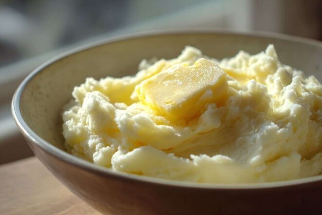 Une généreuse cuillerée de beurre crémeux posée sur un bol de purée de pommes de terre éclatant de vapeur.