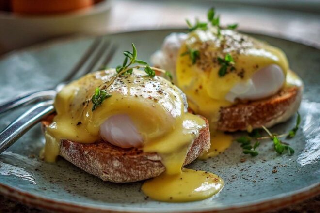 Une sauce hollandaise crémeuse arrosée élégamment sur des œufs pochés parfaits, servis sur une assiette rustique.Image en gros plan d'un fouet qui remue une sauce hollandaise onctueuse et beurrée dans un bol en acier inoxydable.