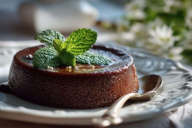 Un flan au chocolat soyeux présenté avec élégance sur une assiette blanche délicate, agrémenté de feuilles de menthe fraîche.