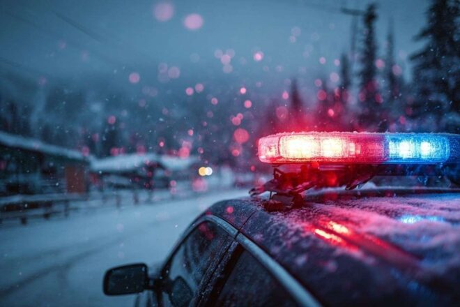 Des lumières bleues et rouges illuminent l'arrière d'un véhicule de police dans un paysage enneigé du Canada.